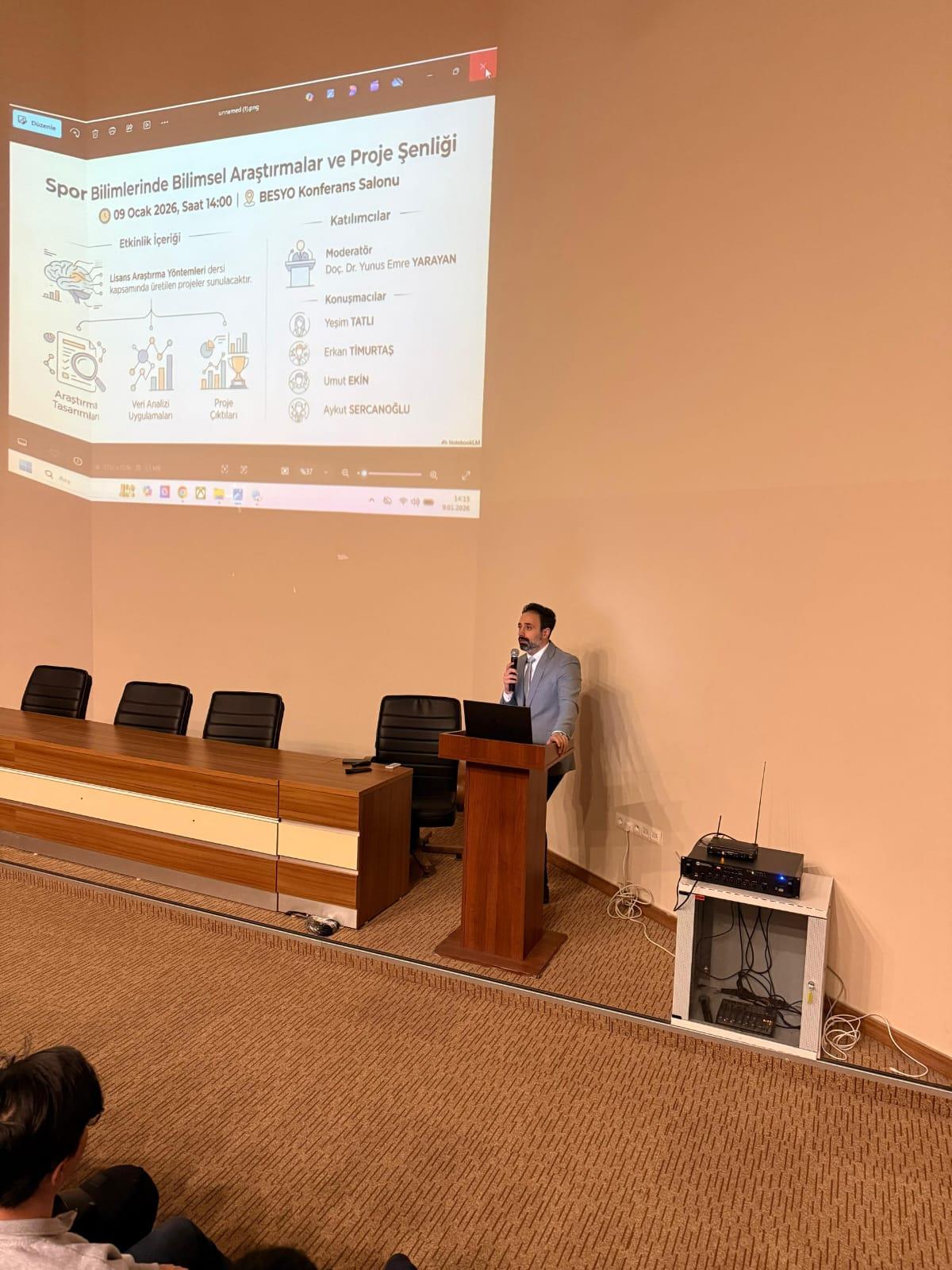 Beden Eğitimi ve Spor Yüksekokulumuz tarafından düzenlenen “Spor Bilimlerinde Bilimsel Araştırmalar ve Proje Şenliği” 09 Ocak 2026 Cuma günü saat 14.00’te Yüksekokulumuz Konferans Salonunda gerçekleştirildi. Etkinliğin akademik danışmanlığını Doç. Dr. Yunus Emre YARAYAN yürütürken, açılış konuşması Doç. Dr. Serdar ADIGÜZEL tarafından yapıldı. Açılışta bilimsel araştırmaların spor bilimleri alanındaki önemi, proje üretme kültürünün öğrencilere kazandırdığı akademik ve mesleki katkılar vurgulandı. Etkinlik kapsamında öğrenciler tarafından hazırlanan bilimsel araştırmalar ve projeler sergilenmiş, katılımcılar tarafından ilgiyle takip edilmiştir. Proje şenliği öğrencilerin araştırma becerilerini geliştirmeleri, akademik sunum deneyimi kazanmaları ve bilimsel paylaşım ortamında yer almaları açısından önemli bir platform sunmuştur.