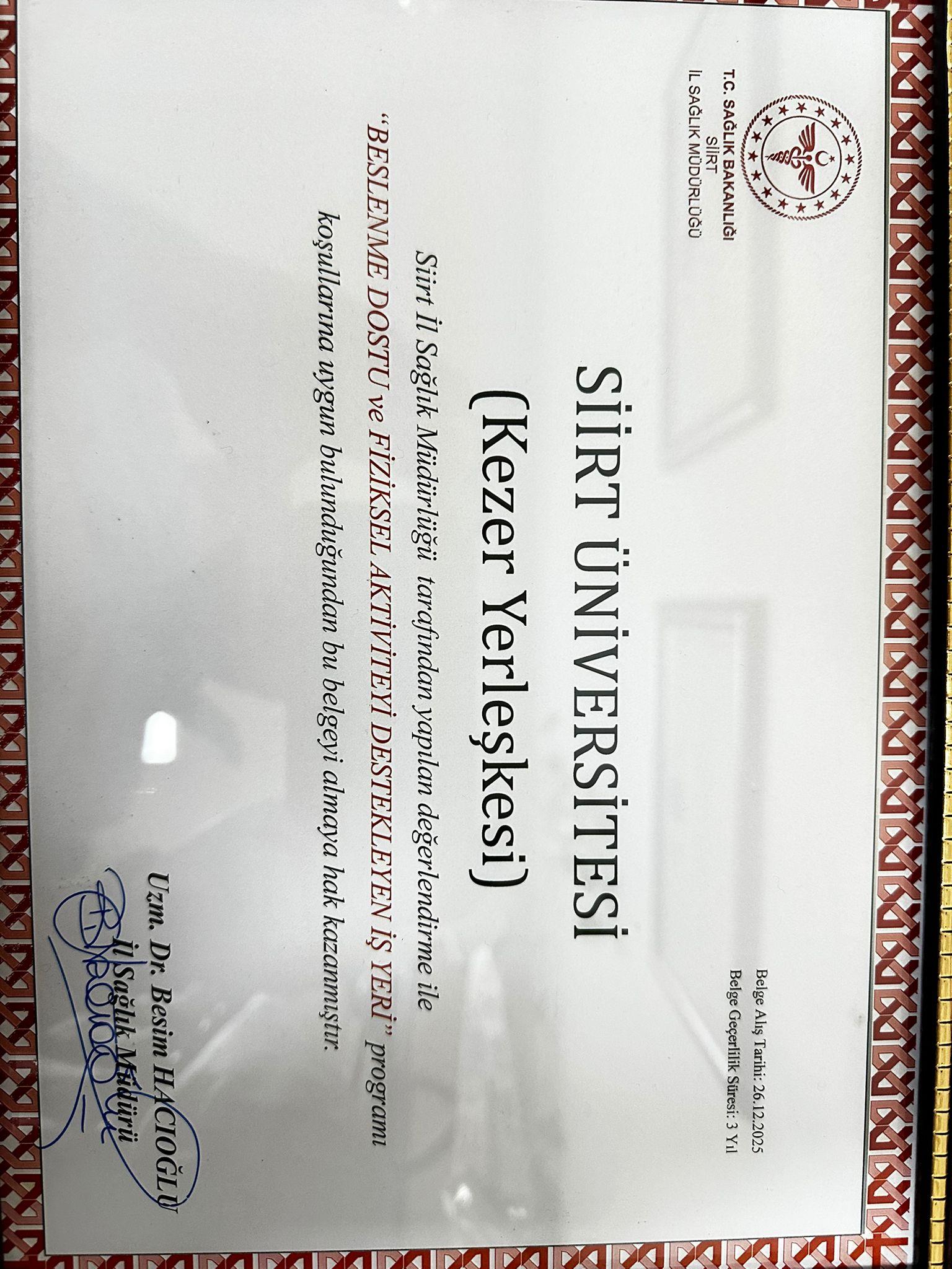 Siirt Üniversitesi, sağlıklı yaşam kültürünü destekleyen uygulamaları sayesinde “Beslenme Dostu ve Fiziksel Aktiviteyi Destekleyen İş Yeri Sertifikası” almaya hak kazandı. Bu önemli sertifika üniversitemizin çalışan ve öğrencilerinin sağlıklı beslenme alışkanlıklarını teşvik eden, fiziksel aktiviteyi destekleyen ve aktif yaşamı kurumsal bir politika hâline getiren yaklaşımının somut bir göstergesidir. Kampüs genelinde yürütülen spor faaliyetleri, hareketli yaşamı teşvik eden alanlar, bilinçlendirici etkinlikler ve sağlıklı beslenmeye yönelik uygulamalar sayesinde Siirt Üniversitesi, sağlığı önceleyen bir üniversite olma yolunda önemli bir adım daha atmıştır.
